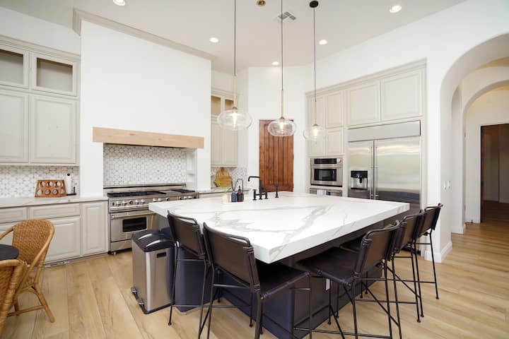 Assurez-vous de passer par un marché fermier local ou une épicerie pour faire le plein de produits locaux avant de cuisiner un repas fantastique à l'aide d'appareils haut de gamme. L'îlot de cuisine vous offre beaucoup d'espace pour préparer et offre une grande surface pour les collations et les boissons tout en socialisant.
