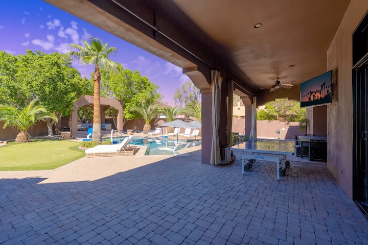 Offrez-vous une escapade relaxante dans cette maison de style complexe hôtelier entièrement rénovée dans la magnifique ville de Mesa, en Arizona. Sunrise Palms Estate est l'endroit idéal pour les familles qui recherchent le confort d'un chez-soi avec une touche de luxe. Profitez de la superbe piscine et du spa, en vous prélassant sur le canapé donnant sur l'eau avec vue sur la montagne. Un emplacement imbattable à proximité de restaurants et de boutiques ! Découvrez Mesa avec nous et apprenez-en plus ci-dessous !