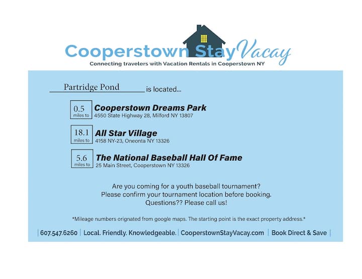 Nous sommes là pour vous aider ; Cooperstown Stay Vacay met en relation les voyageurs généraux avec des locations de vacances à Cooperstown NY et dans les environs. Nous offrons un large éventail d'options d'hébergement : appartements privés, maisons privées, cadre champêtre, escapades au bord de l'eau et plus encore ! Le personnel de Cooperstown Stay Vacay est local, compétent et est très sympathique. Nous sommes tous des habitants de Cooperstown, élevons nos familles et vivons notre vie à Cooperstown. Cela nous offre un niveau inégalé de connaissances locales expertes pour vous aider. Le service client est notre priorité numéro un, n'hésitez pas à nous appeler ou à nous envoyer un e-mail si vous avez des questions. Nous connaissons très bien toutes nos propriétés et la région, nous pouvons vous aider à trouver cette location de vacances parfaite pour vos besoins.