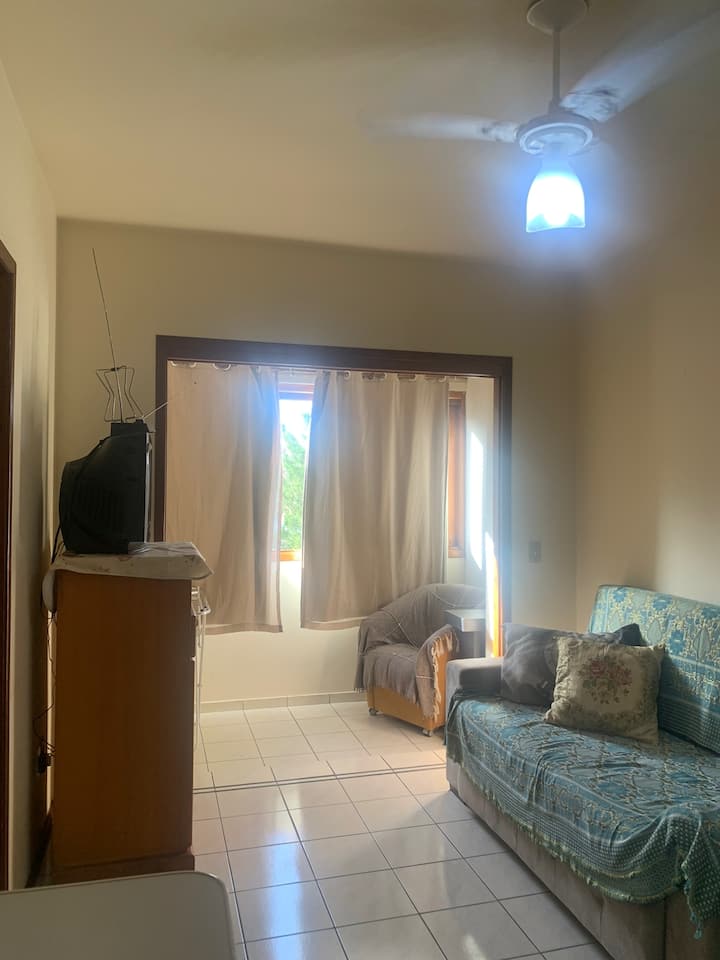 Appartement avec une grande chambre contenant un lit double, 4 oreillers avec taie d'oreiller, un drap et une couette, 3 matelas simples, une armoire, un ventilateur de plafond/ventilateur d'évacuation, des cintres, des chapeaux ou d'autres ustensiles. Une fenêtre en verre coulissante et un volet de type occultant et/ou une ventilation.