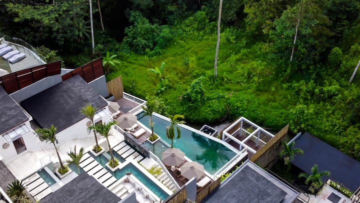 La villa descend en cascade magnifiquement vers les régions inférieures de la propriété, vous permettant de vraiment profiter de l'excellence sans compromis d'Ubud avec facilité! Il y a un coin salon en contrebas près de l'étage du milieu accompagné d'une chambre à portée de main, vous êtes encouragé à descendre un étage de plus jusqu'à votre propre piscine à débordement surplombant les plus belles vues sur la jungle d'Ubud! Juste en dessous de la piscine, vous trouverez également votre propre shala de yoga, parfait pour méditer et se détendre.