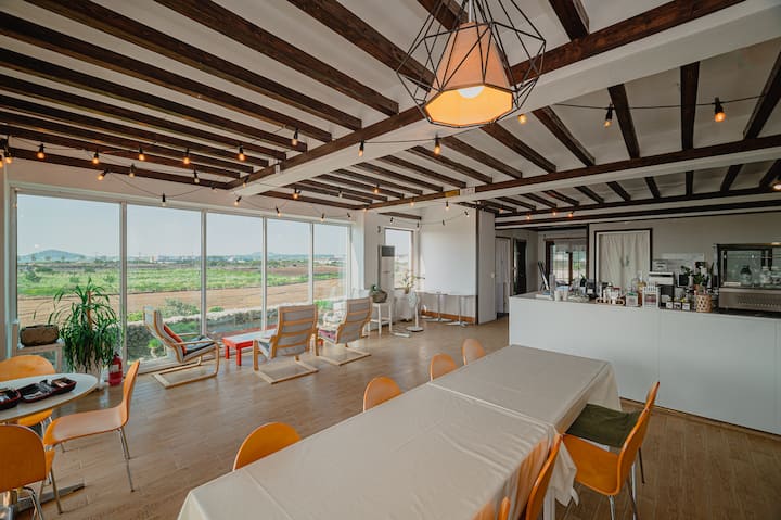 Le café sur le toit offre une vue panoramique imprenable sur l'est de Jeju. La mer bleue lointaine, Seongsan Ilchulbong, l'île d'Udo et la montagne Hallasan se dévoilent devant vous comme un tableau majestueux.