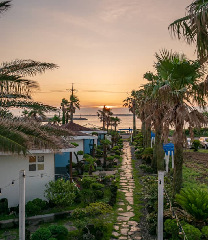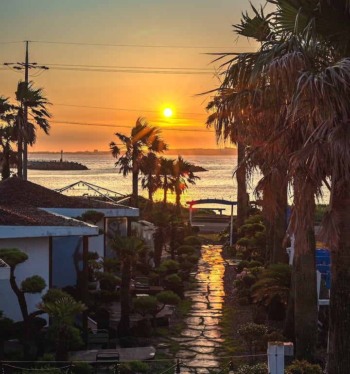 Une pension à Jeju avec vue sur le lever du soleil sur la mer.