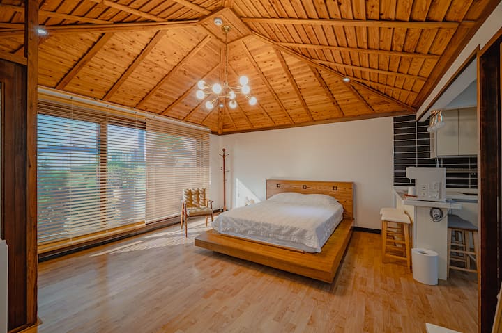 L'unité 101 est une villa privée et indépendante avec une capacité maximale de trois voyageurs. Il comprend une chambre, une cuisine et une salle de bain. Les voyageurs profiteront d'un spa extérieur privé et d'une terrasse individuelle. La chambre offre une vue magnifique sur le jardin extérieur, la mer et le pic Seongsan Ilchulbong.