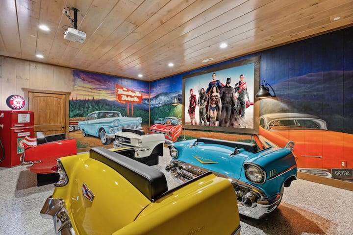 Mais peut-être que le meilleur plaisir de tous dans ce Lodge est le cinéma en plein air Dancing Fox! Un retour aux débuts des voitures de sport et des classiques intemporels. Le théâtre est peint à la main par le talentueux artiste urbain Curtis Glover. Asseyez-vous dans une véritable Chevy Bel-Aire de 1957 ou dans une Spicy Hot Camaro de 1965 au cinéma en plein air, ou essayez les deux jeux de conduite Fast n Furious ou notre fabuleuse moto Road Burner! Tout a été créé pour que vous puissiez créer de nouveaux souvenirs avec votre famille ou vos amis et collègues!