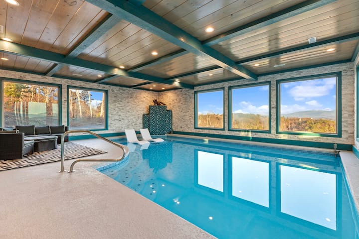 Ce pavillon bavarois est un centre de divertissement extraordinaire! Nous pouvons dire sans honte que la piscine intérieure chauffée est la plus grande que nous connaissons dans les Smokies! Avec des murs de pierre, des carreaux portugais, des poutres turquoise taillées à la main, une cascade avec une sculpture de renard en bronze et des chaises longues dans la piscine. Vous pouvez passer vos après-midi au bord de la piscine, d'autant plus que