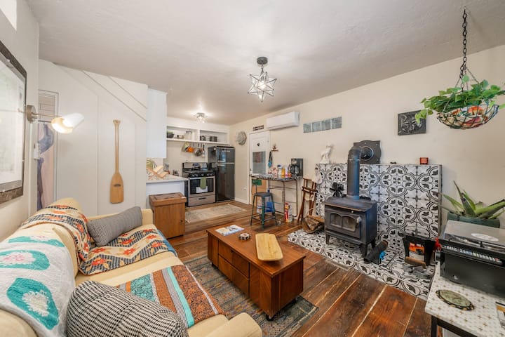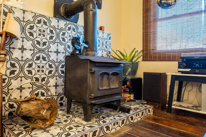 Notre cabane d'une chambre récemment mise à jour constitue une déclaration de simplicité et de déconnexion du monde numérique. Vous êtes chaleureusement accueilli dans le salon par un poêle à bois et des sols en pin récupérés centenaires. Notre cuisine entièrement meublée est équipée d'un réfrigérateur rétro, d'une cuisinière à gaz à 5 feux, d'un micro-ondes, d'un éclairage sous l'armoire, d'ustensiles de cuisine/ustensiles de cuisine étendus et d'un bar à café complet. La chambre est fraîche et confortable et la salle de bain a été récemment rénovée. Mettez un vinyle sur le tourne-disque stéréo pendant que vous déballez, préparez un repas, lisez un livre ou allumez un feu pour vous détendre.