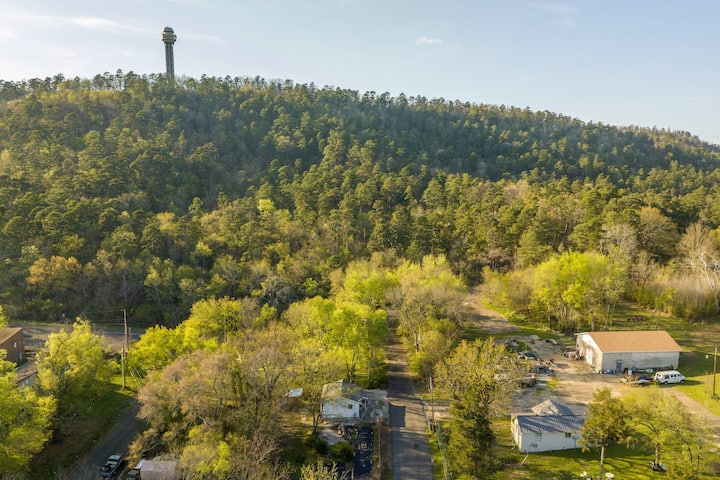 Bienvenue à Goat Rock Cabin. Nous sommes un refuge naturel et isolé niché au bord de la colline de Hot Springs Mountain, mais à moins d'un mile de Bathhouse Row et de notre magnifique centre-ville. Parfait pour les voyageurs en solo ou en couple et leurs amis à fourrure, notre propriété privée et paisible dispose d'une grande cour clôturée, d'une douche extérieure chauffée et d'un spacieux patio en gravier avec foyer en pierre naturelle.
