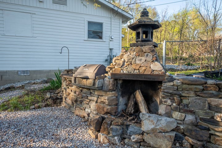 Ouvrez les portes de notre patio latéral couvert et profitez de vous asseoir ou de travailler au bar à l'air frais. Ou entrez dans notre oasis de jardin ; bordée de deux côtés par des vignes de mûres sauvages, généreusement aménagées avec des plantes indigènes et arborée par des arbres d'ombre matures, vous n'aurez pas l'impression d'être au milieu de la ville. Détendez-vous dans nos confortables rockers sur le patio en gravier tout en repérant les oiseaux chanteurs, ou admirez la vue sur la Hot Springs Tower tout en vous balançant dans le hamac fourni. Vers la fin de la journée, allumez les guirlandes lumineuses et allumez un feu dans la cheminée extérieure alors que l'air nocturne d'Ouachita s'installe dans la vallée. Écoutez les hiboux…on les entend souvent la nuit en appelant la forêt en flanc de montagne.