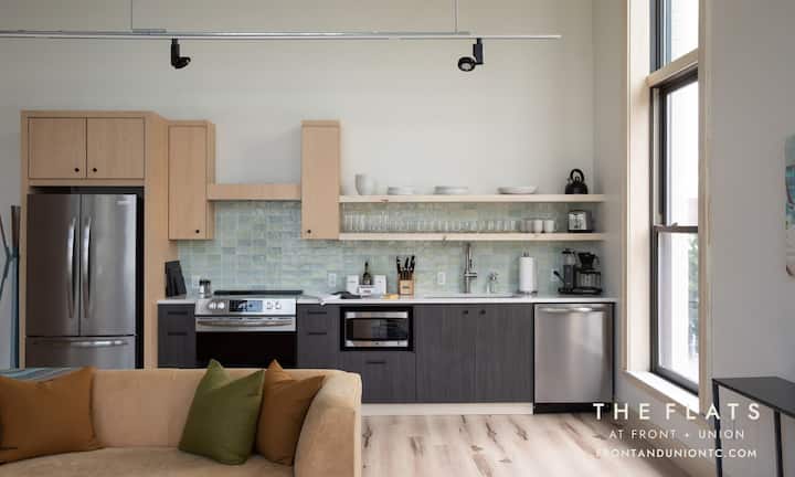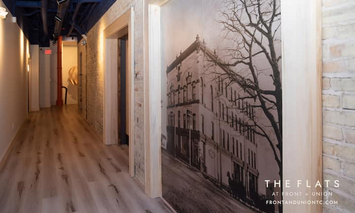 The Flats at Front + Union (100 E Front Street, Traverse City, MI) est un boutique-hôtel qui se trouve au coin le plus important du centre-ville de Traverse City, à l'angle de Front St et Union St. À un pâté de maisons de tout, y compris les plages, la marina, la vie nocturne et les restaurants du centre-ville de Traverse City. Chaque appartement dispose de sa propre place de stationnement au centre-ville.