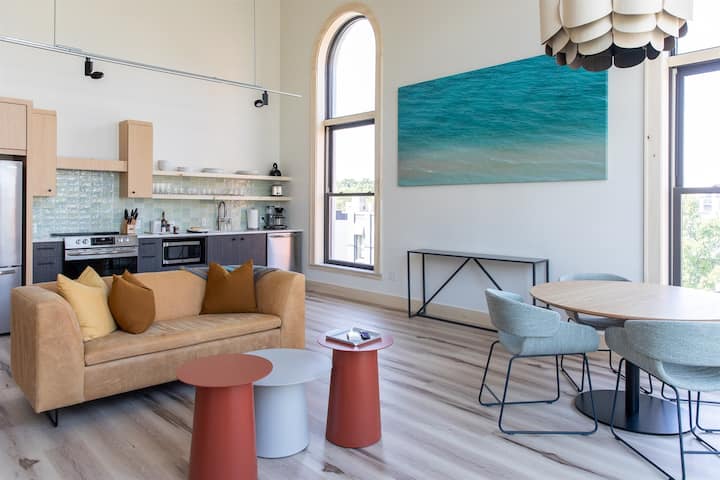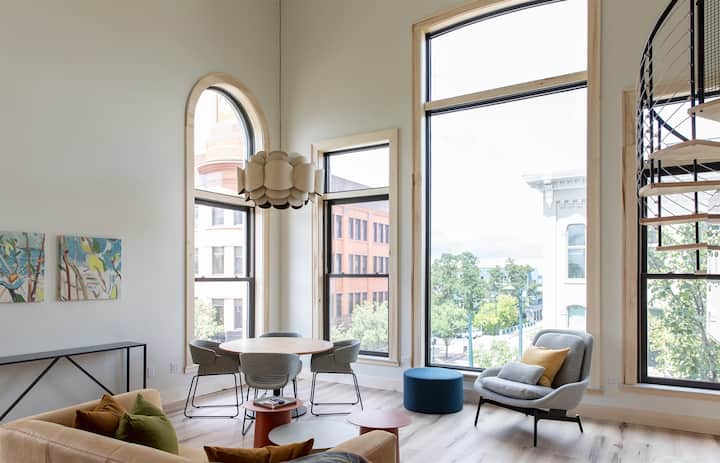 Les appartements de Front + Union comprennent 6 locations de vacances modernes dans un bâtiment historique. Les appartements sont situés à l'emplacement privilégié du centre-ville de Traverse City, 100 E Front St. Vous aurez la liberté de vous promener juste devant votre porte pour faire du shopping, de la nourriture et des boissons uniques, ainsi que de vous promener à un pâté de maisons de la plage ou de la marina. Peut-être que l'un des nombreux festivals ou événements se déroule à un pâté de maisons de l'Open Space. West Bay est visible depuis le coin avant Flats sur chaque étage. L'emplacement central permet de passer votre journée différemment de votre après-midi ou de votre soirée et votre voiture est garée gratuitement directement derrière l'immeuble. Le sentier de la TARTE se trouve juste devant notre porte, prévoyez donc d'apporter votre vélo et de profiter d'un trajet jusqu'à Suttons Bay.