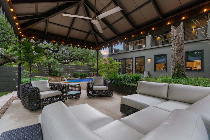 Cette maison moderne avec piscine chauffée est votre oasis privée au centre-ville d'Austin. Située dans le quartier le plus prisé de la ville, elle est accessible à pied depuis des bars, restaurants, magasins, lieux de baignade et festivals emblématiques. La maison de 4 chambres et 3 salles de bain dispose d'une piscine chauffée avec une cascade depuis le spa, et des espaces de vie intérieurs et extérieurs, des salles à manger et des cuisines ombragées par de beaux chênes patrimoniaux avec une vue imprenable sur les toits du centre-ville. Profitez du mélange parfait de luxe, de confort et de commodité !