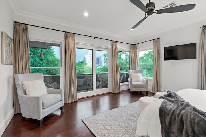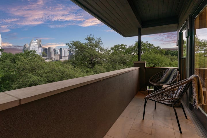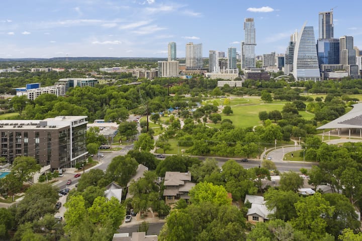 Nichée au-dessus du célèbre Rooftop Patio d'El Alma et du barbecue de renommée mondiale de Terry Black, la maison surplombe Butler Park et Auditorium Shores, ce qui en fait votre base idéale pour les amis et les familles qui insistent pour vivre une expérience incroyable à Austin.
