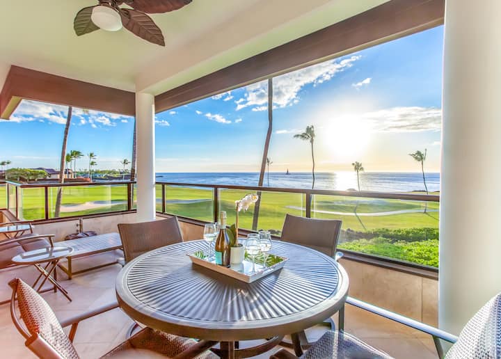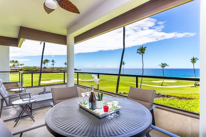 Spectaculaire condo en bord de mer offrant une vue panoramique sur l'océan Pacifique au célèbre Mauna Lani Point. Cette nouvelle propriété de rêve sur le marché offre une vue imprenable sur l'océan ainsi qu'une vue imprenable sur l'île de Maui à travers le canal océanique. Observez les baleines à bosse et tournez les dauphins dans le confort de votre lit, ou tout en profitant du petit déjeuner sur le spacieux lanai. Construit avec le vaste océan à l'esprit, ce condo d'angle de luxe dispose de fenêtres enveloppantes qui créent une belle expérience de vie intérieure-extérieure. Accentué de bois Koa d'origine locale, la cuisine entièrement rénovée et le salon ouvert se connectent au lanai extérieur par de grandes portes coulissantes en verre qui peuvent être ouvertes à la brise marine tropicale. Profitez de magnifiques dîners au coucher du soleil depuis le lanai ou mangez à l'intérieur sur la grande table de la salle à manger personnalisée qui peut accueillir 12 personnes.