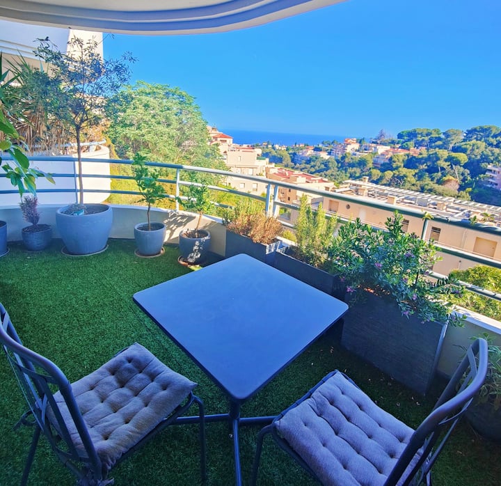 Cet appartement vous offre tout le confort nécessaire pour un séjour agréable à Nice. Profitez de la vue magnifique depuis la terrasse, détendez-vous dans le salon confortable, préparez vos repas dans la cuisine bien équipée, et reposez-vous dans la chambre accueillante. Le tout, dans un environnement calme et paisible.