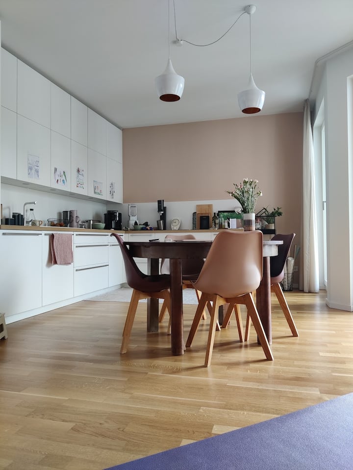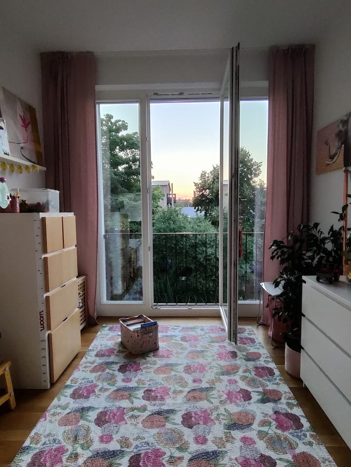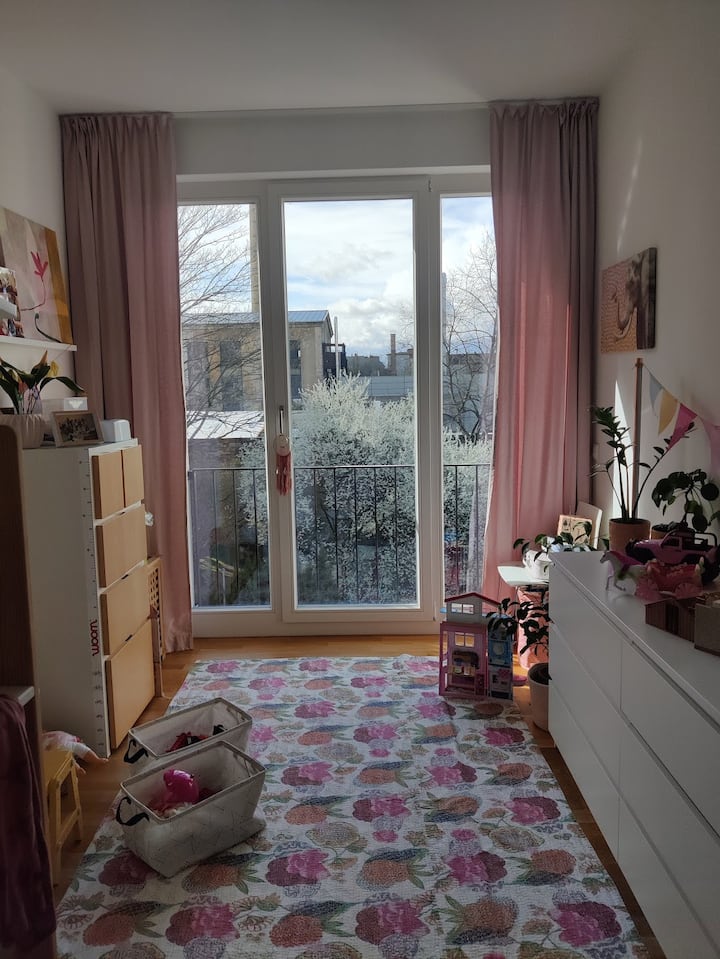 Bienvenue dans ma chambre d'enfant décorée avec amour (environ 12,6 m²) avec un magnifique soleil du soir et une orientation ouest – parfaite pour tous ceux qui recherchent une retraite calme et confortable dans une atmosphère soignée. L'appartement est moderne, très propre et est apprécié par les clients pour cela.