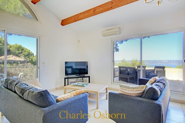 La maison, entièrement climatisée, est très agréable avec sa pièce de vie à l'étage pour profiter de la vue sur l'étang de Thau. La cuisine spacieuse est entièrement équipée de divers appareils : grille-pain, bouilloire, et machine à café. Elle s'ouvre sur la salle à manger, qui est reliée au salon, offrant ainsi un espace convivial et spacieux. Le salon est équipé d'une TV écran plat et de deux grands canapés. L'étage est baigné de lumière avec ses larges baies vitrées donnant sur deux grandes terrasses équipées de mobilier extérieur (salon de jardin, table à manger, plancha). C'est l'endroit idéal pour se détendre en profitant de la magnifique vue sur l'étang de Thau et la verdure du Mont-Saint-Clair.