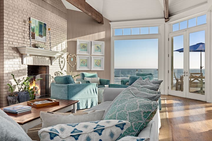 À l'intérieur, vous profiterez d'équipements et d'espaces soigneusement sélectionnés et conçus pour se divertir avec style ou se détendre en famille ou entre amis. Les points forts comprennent deux suites principales palatiales, cinq chambres supplémentaires, un jardin privé directement sur la plage, un sauna, un spa extérieur, une cave à vin à l'italienne et une vue dégagée sur l'océan à travers des fenêtres et des portes du sol au plafond. Le décor donne une touche haut de gamme sur le style de plage californien aéré, avec des teintes côtières, des plafonds à poutres rustiques et des accents de charme de shiplap et de briques blanches. Une magnifique disposition ouverte dispose d'une cuisine de chef surdimensionnée, d'un salon spacieux et d'une belle table à manger avec vue panoramique sur le Pacifique. Les portes-fenêtres mènent à deux balcons pittoresques au deuxième étage, tandis que le rez-de-chaussée dispose d'un deuxième coin salon avec un bar et d'un foyer. La cour arrière sert de plage personnelle, située tranquillement derrière les dunes de sable et entourée d'une clôture en bois pittoresque.