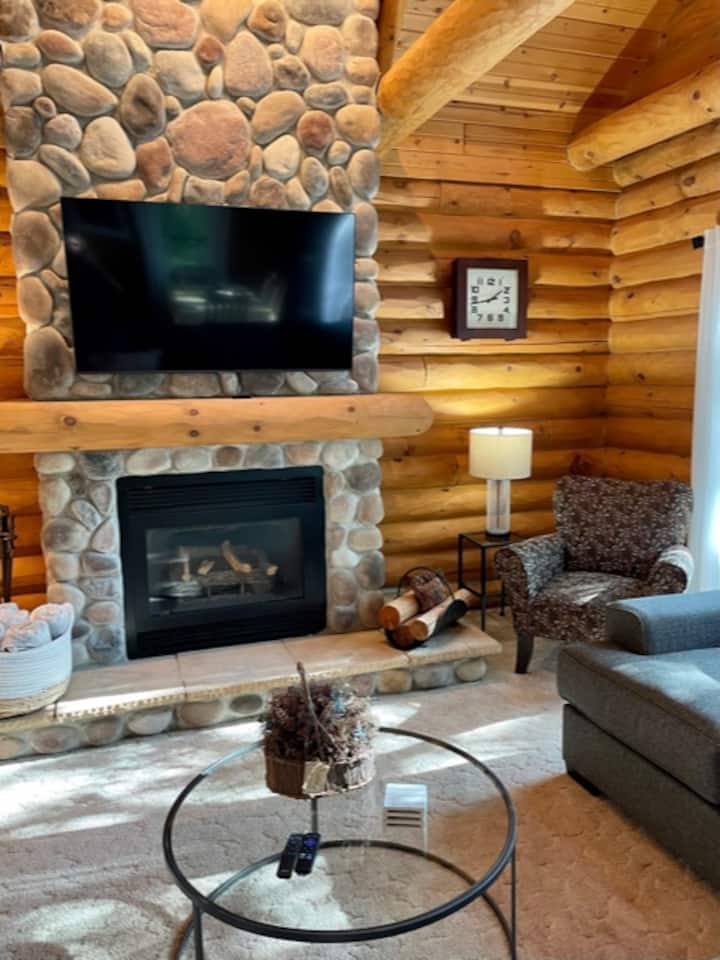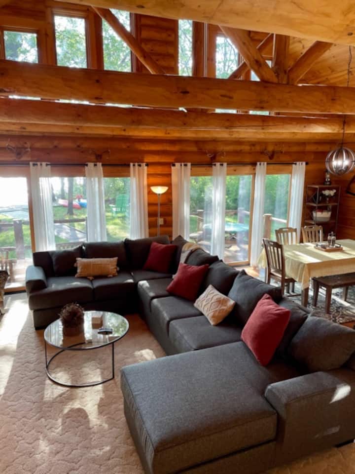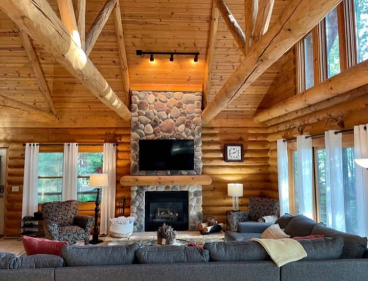 Il s'agit d'une maison en rondins complète à l'intérieur et à l'extérieur, très rustique et unique. Comprend une jetée pour amarrer votre propre bateau ou une location. Le terrain est plat, donc il n'y a pas de pente ou de marches vers la plage. Entrée en eau très peu profonde, donc idéale pour les petits de votre famille. Grande terrasse enveloppante avec mobilier d'extérieur. Deux lits queen size, deux lits jumeaux, un lit superposé et un pack-n-play. Peut être installé pour 2 familles, une en bas et une en haut. À l'étage se trouve une grande chambre avec un lit queen et un lit superposé, ainsi qu'un vestiaire et une salle de bain avec des portes de poche. Deux chambres en bas, une chambre avec une reine et une chambre avec deux lits jumeaux. Vous pouvez installer le pack-n-play en haut ou en bas dans la chambre queen size.