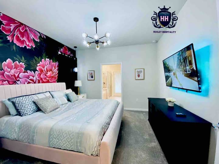 *Chambre 1 : chambre Master King florales avec salle de bain principale avec salle de bain principale attenante. Téléviseur écran plat avec lumières LED.