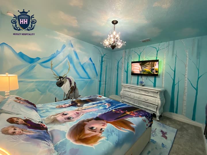 * Suite Chambre 4 : Continuez votre voyage Frozen au château de glace de la reine Elsa avec des chutes de neige dans ce lit superposé complet personnalisé avec escaliers. Regardez votre tête. Armoire avec 32" smart TV. Rejoignez Elsa & Olaf dans ce pays des merveilles hivernal.
