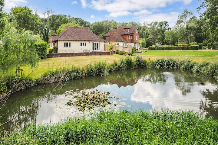 Le chalet est situé dans le terrain de la maison des propriétaires, mais conserve son intimité avec son propre beau jardin. Le salon s'ouvre sur un patio avec salle à manger bistrot et bancs, et la pelouse descend vers un étang tranquille. Vous avez également accès à une forêt privée avec un coin repas secret à l'extérieur, et un ruisseau qui s'enroule à travers les arbres. Consultez la section Informations utiles et le règlement intérieur, ou visitez-nous directement pour obtenir des détails importants sur ce logement.