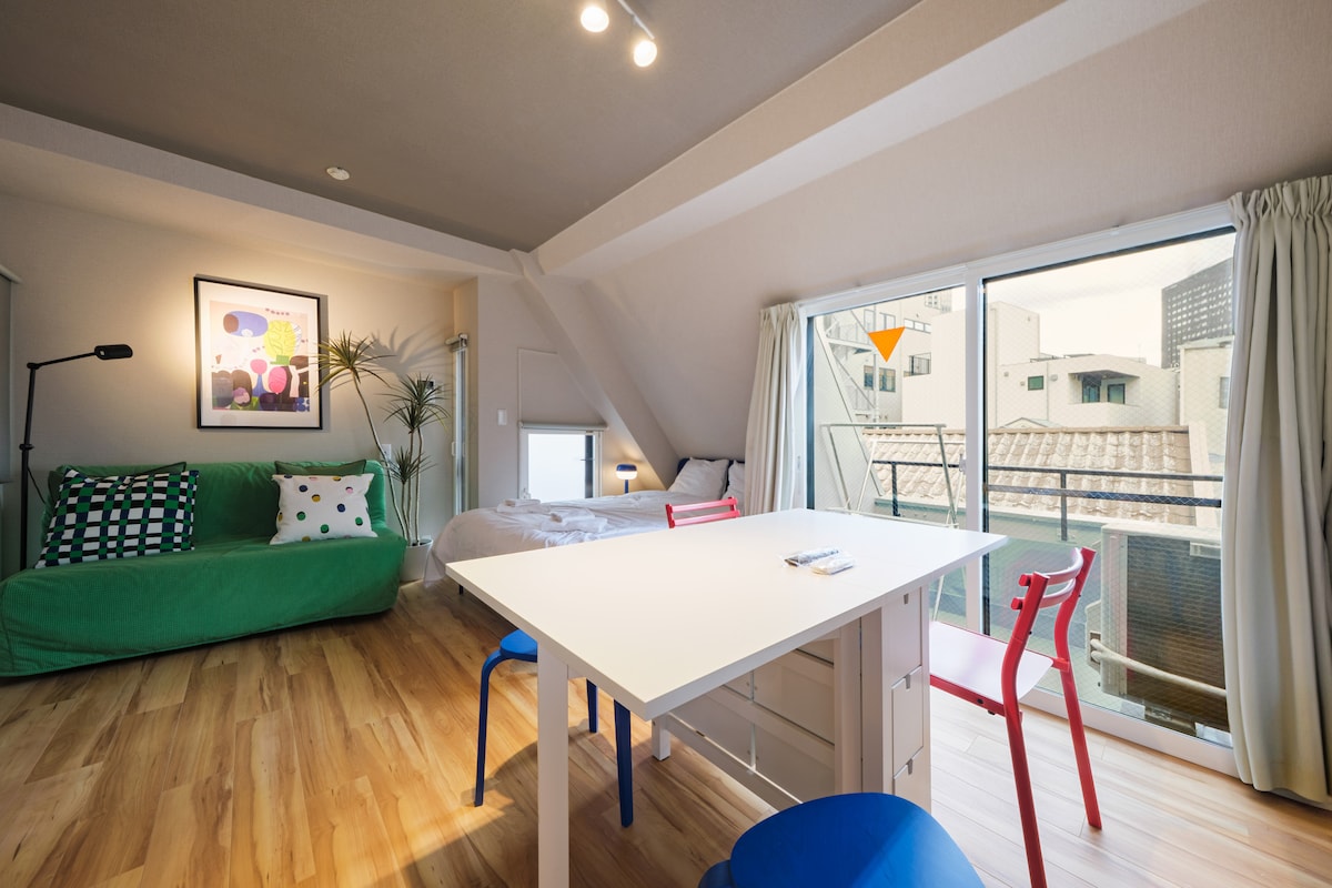 Séjournez au cœur de Tokyo dans une ambiance décontractée ! Cet appartement d'environ 20 m2 dispose d'une cuisine séparée, d'une salle de bain et de toilettes. Tous les meubles en bois rustiques et durables sont fabriqués à Yokohama. Il y a une variété de restaurants et de bars confortables, il y a deux dépanneurs juste en face qui sont ouverts 24 h/24. L'hôte est également disponible car il habite dans le même immeuble.