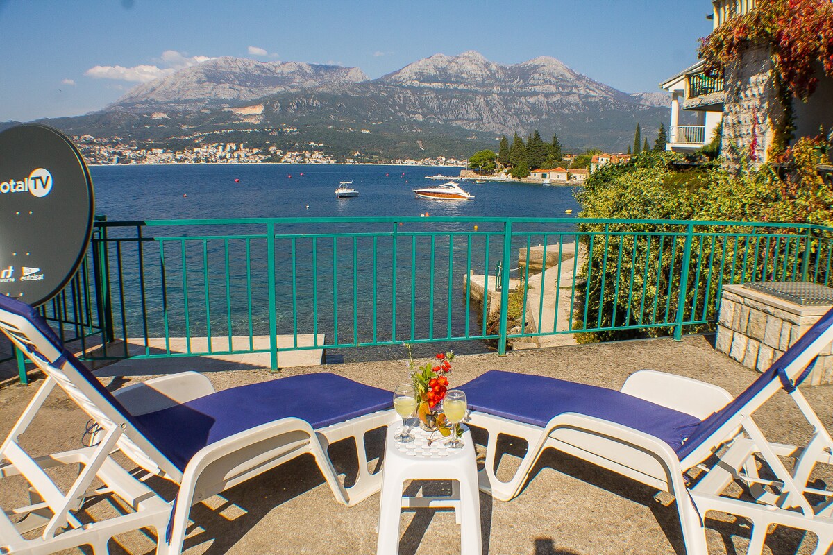 Le studio/appartement est situé au premier étage de la maison et dispose de sa propre cuisine, salle de bain et balcon privé. Depuis le balcon, vous pouvez profiter d'une vue magnifique sur la baie de Boka et le détroit de Verige. Les invités ont également accès aux terrasses devant la maison, qui sont disposées sur trois niveaux. Ces terrasses sont équipées de tables à manger et de tables basses, ainsi que d'une douche extérieure, idéale pour se détendre et profiter de l'air frais de la mer.