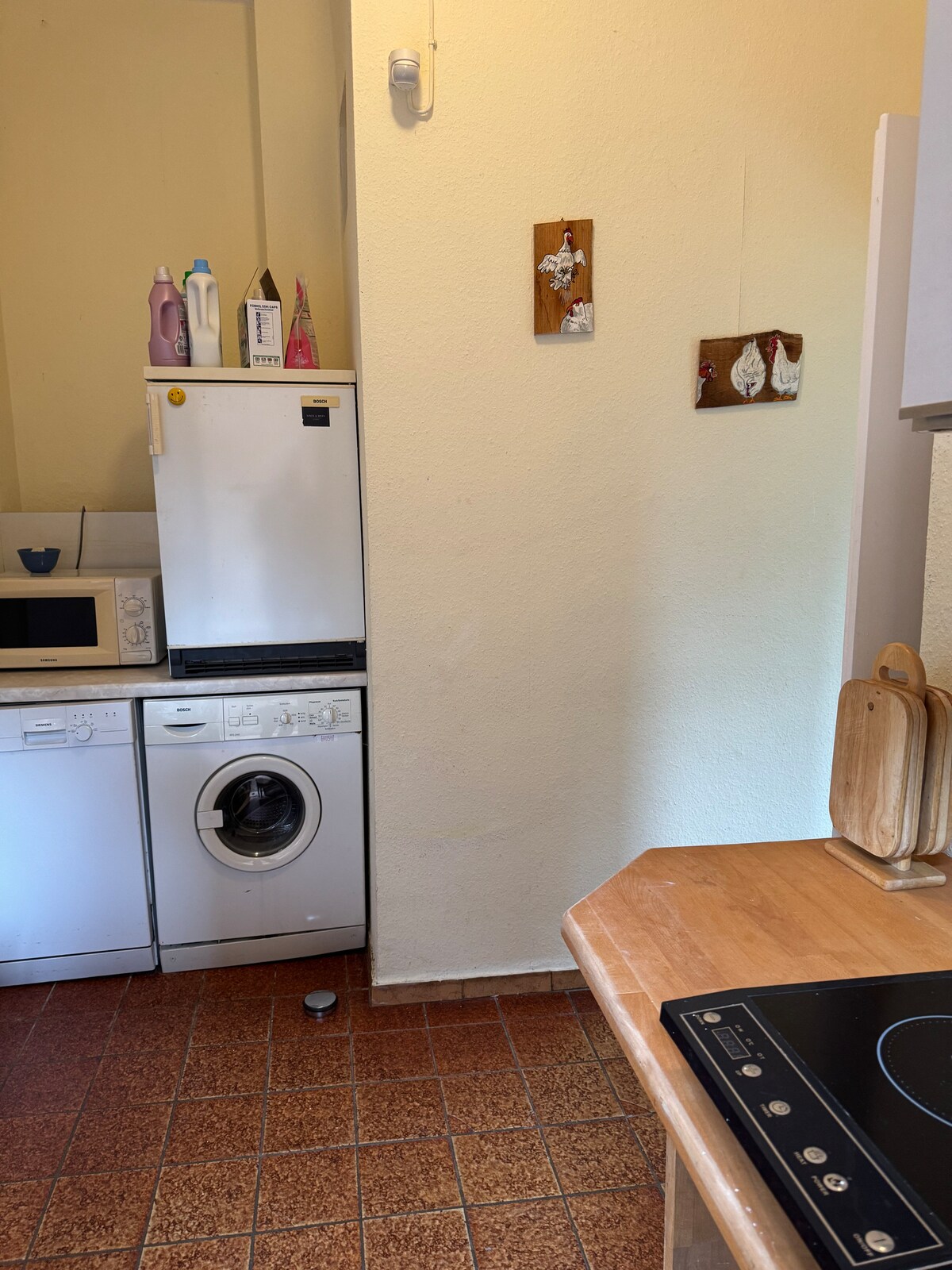 Cet appartement d'une pièce donnant sur la cour dispose d'une entrée indépendante depuis une grande terrasse couverte. C'est une petite chambre avec salle de bain et mini cuisine. L'espace de vie est plutôt petit. Cependant, il y a une grande terrasse couverte avec des sièges où il est possible de fumer.