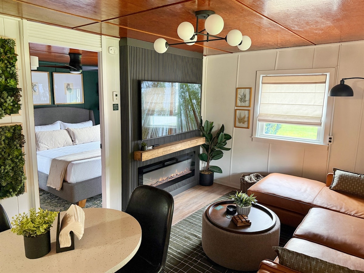 Welcome to The Green Door Cabin, located in a quaint little lake town just 15 minutes to Lake Geneva. Within walking distance to the town of Twin Lakes and Lake Mary, this cabin has a great location in a quiet neighborhood. Completely renovated in 2024, our cabin is sun-filled, open, and features high-end furnishings throughout. Outside, you will find a large yard space complete with patio lights to play yard games even after dark, a fire pit, and a propane grill.