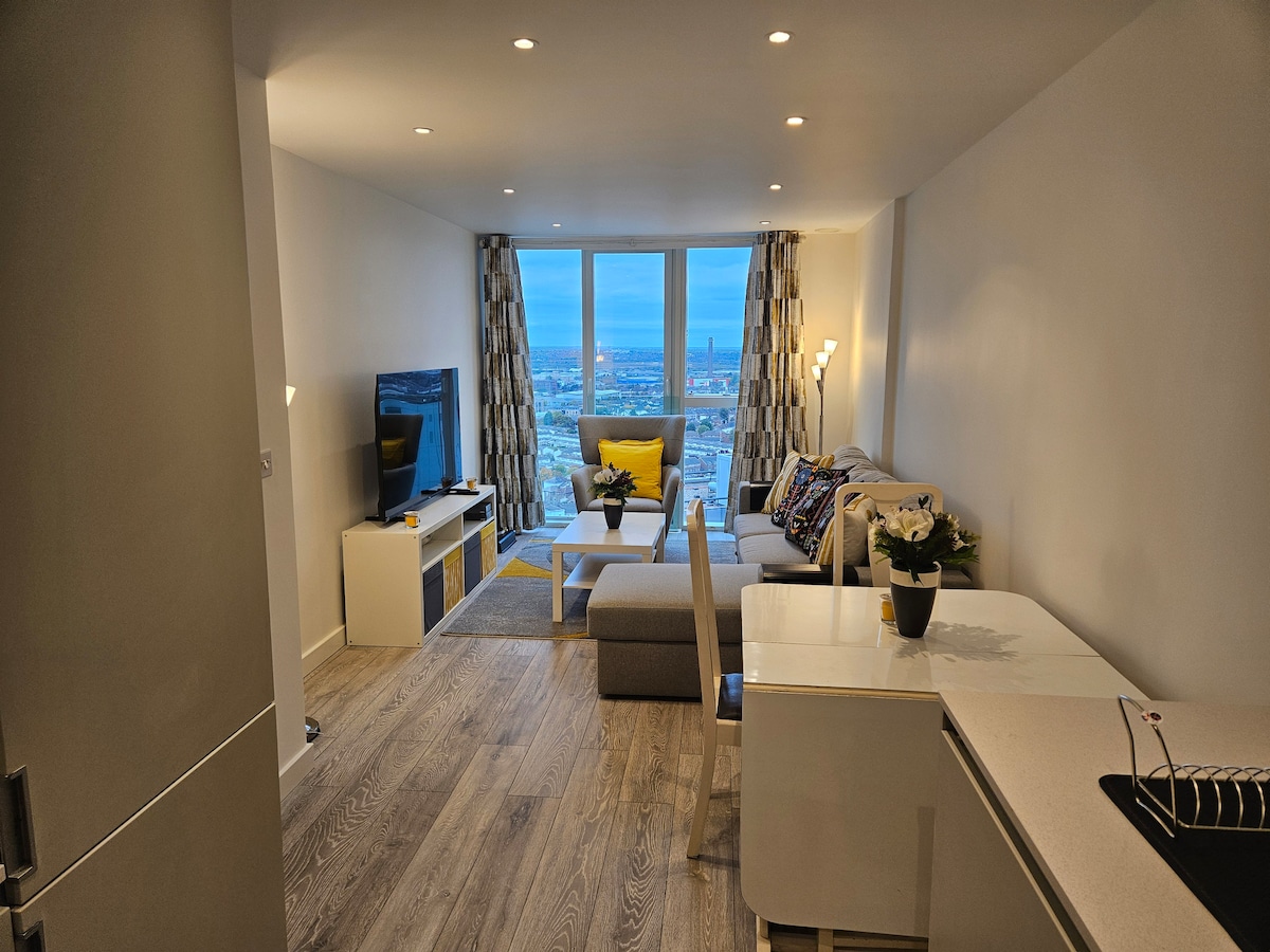 Bienvenue dans notre tout nouveau studio à thème élégant dans un bâtiment avec ascenseur. Profitez d'un mobilier moderne, d'une cuisine entièrement équipée avec lave-linge et lave-vaisselle, d'une salle de bain spacieuse avec douche, d'une chambre confortable et d'un balcon privé. Profitez du stationnement gratuit, du WiFi ultra-rapide partout + de la télévision intelligente, de l'accès à une salle de sport et à un espace de travail partagés. Il se trouve à quelques minutes de la gare d'Orpington, avec un accès facile à Londres. L'hôpital et le centre commercial d'Orpington sont également à distance de marche.