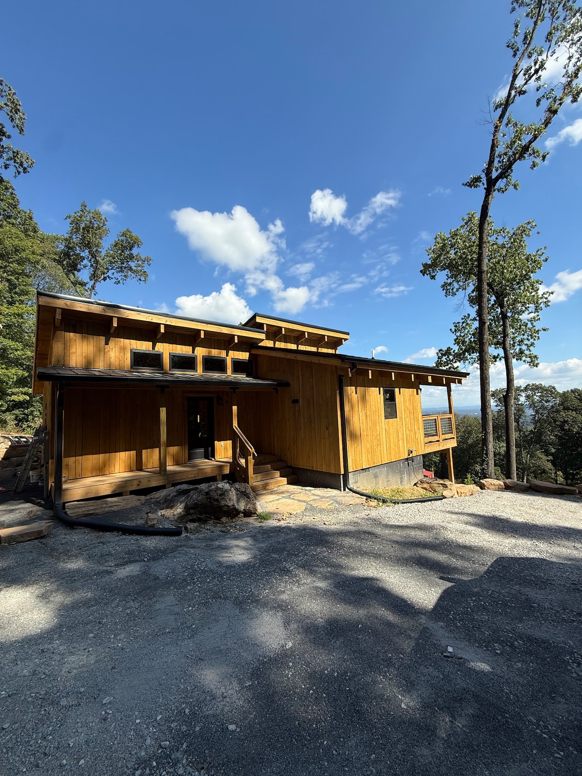 Welcome to the Lookout Mountain Birdhouse! This modern cabin in the woods (completed in 2021) is surrounded by stone, trees, and a breath taking view! This house was built to stretch towards the clouds with a 1000 sqft deck and bird's eye view from inside. The 8 foot windows allow for an unobstructed view. The sunset facing view and valley below offer pure relaxation. Watch out for hang gliders and eagles- they love to fly by! Whatever your reason for visiting, this place has it