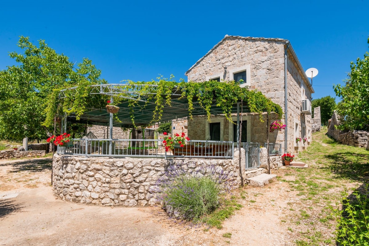 Beautiful three bedroom house Memories and joy is located in Slivno near Imotski, only 30 kilometers away from Makarska. Small village in the Dalmatian hills and is ideal for a pleasant family vacation. Villa can accommodate up to 6 persons. At your disposal are 3 bedrooms, 2 bathrooms, living room and fully equipped kitchen with dining area. Beautiful, spacious garden, large pool, outdoor dining area with grill makes this house ideal for a completely stress-free and perfectly relaxing holiday.