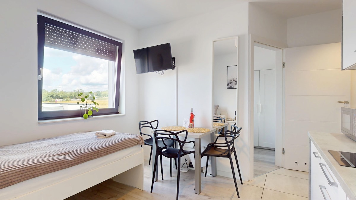 Appartement moderne dans un quartier calme et verdoyant, à quelques minutes de l'autoroute. Parfait pour les voyageurs d'affaires et les touristes. Les voyageurs ont accès à : un salon spacieux avec cuisine et salle à manger (également comme endroit pour dormir), une chambre avec un lit double, une chambre simple, une salle de bain avec baignoire et douche, un grand balcon. Appartement au 1er étage, avec une entrée séparée et une place de stationnement pour 2 voitures.