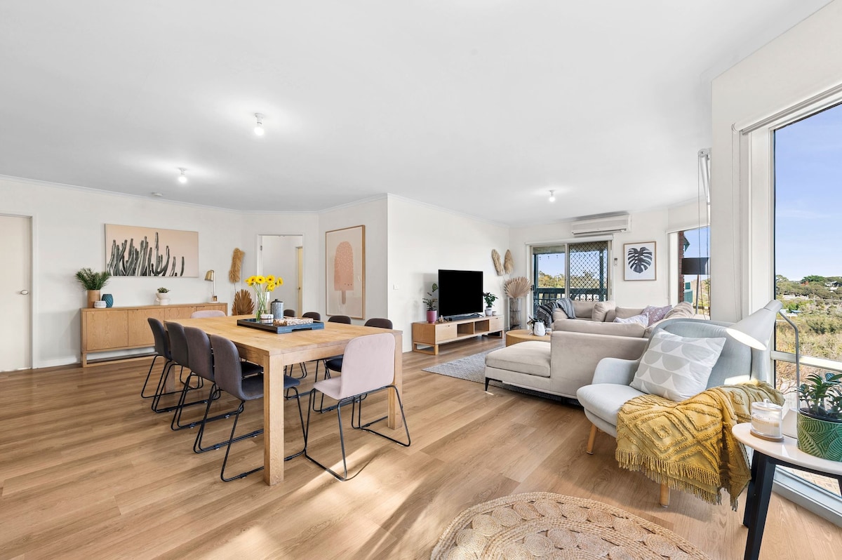 Unwind in this light-filled beach house, just 2km from the beach & Peninsula Hot Springs-perfect for a relaxing getaway. Enjoy your morning coffee or afternoon wine on the spacious deck, complete with fireplace & tree-top views. Sleeps up to 6 guests across 3 queen bedrooms, each with ample wardrobe space and a full-length mirror. Enjoy free WiFi, a 65” Smart TV & board games. Cook with ease in the fully equipped kitchen. Plus, enjoy aircon/heating, a bath, laundry & ample parking.