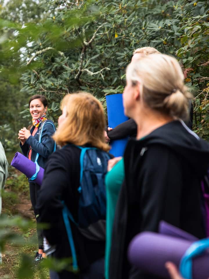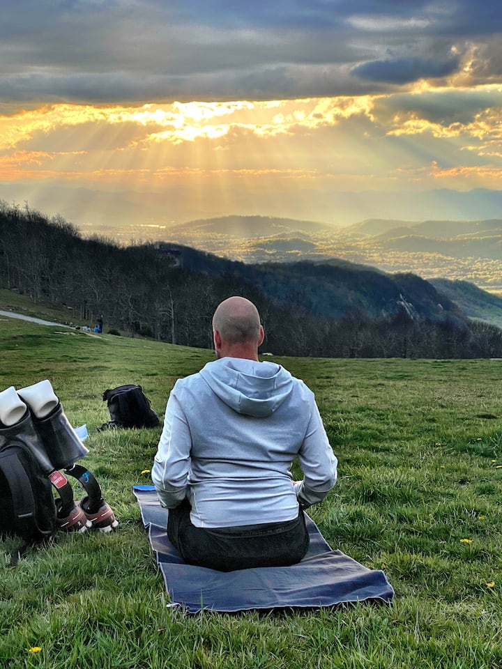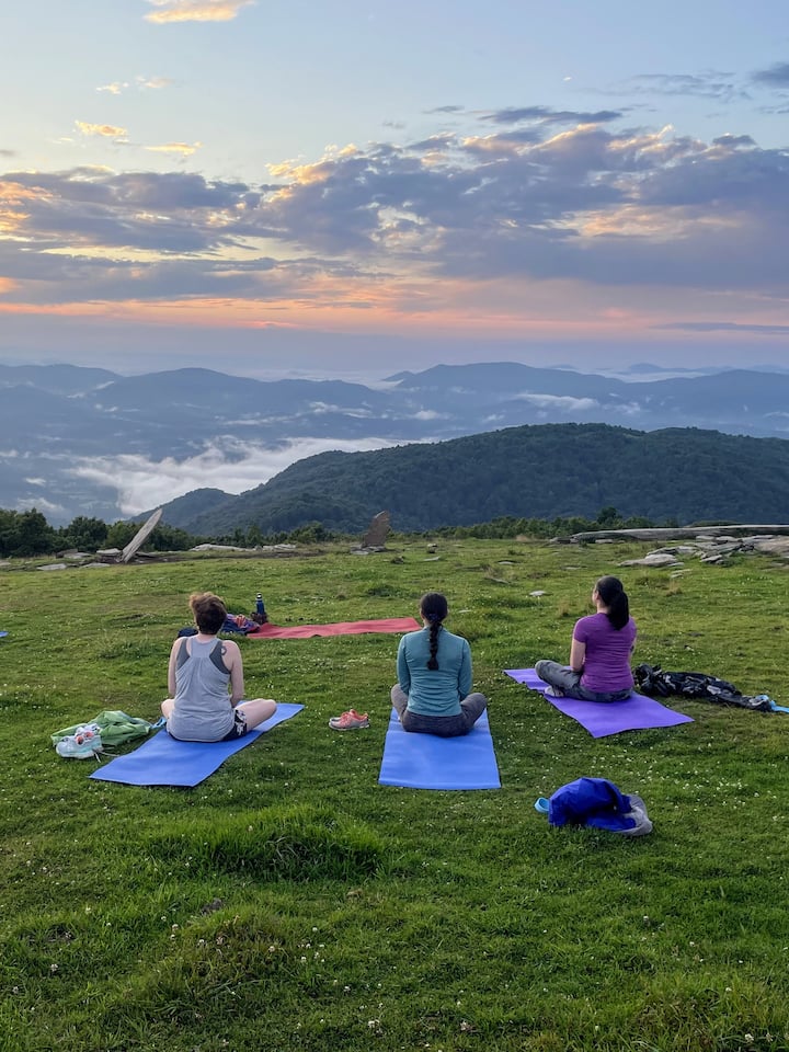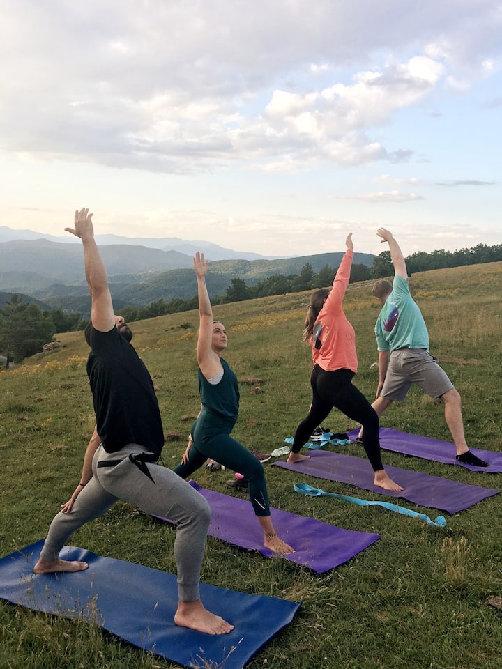 Randonnée et yoga au coucher du soleil au sommet d'une montagne