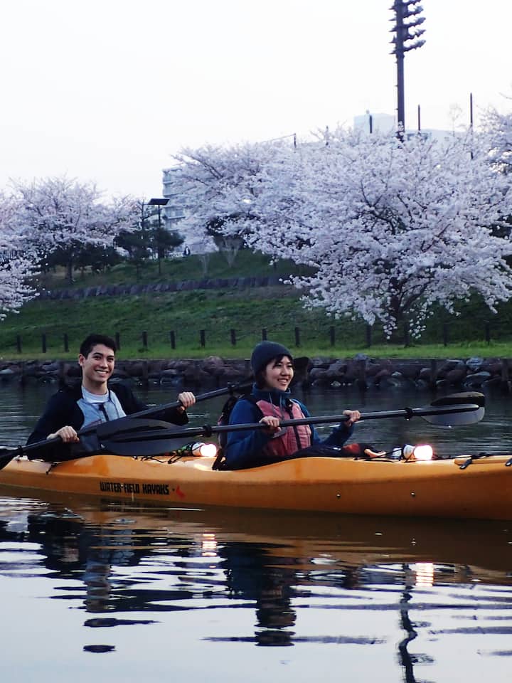 Pagayer sur les voies navigables de Tokyo du coucher du soleil à la nuit