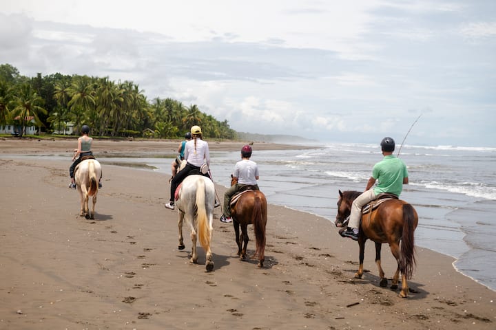 Balade à cheval sur la plage avec des chevaux heureux et en bonne santé