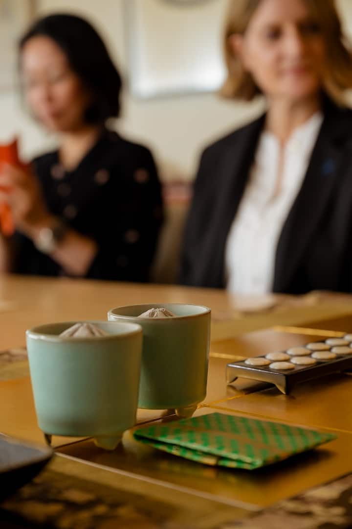 Atelier de confection de pâtisseries japonaises colorées et de thé vert