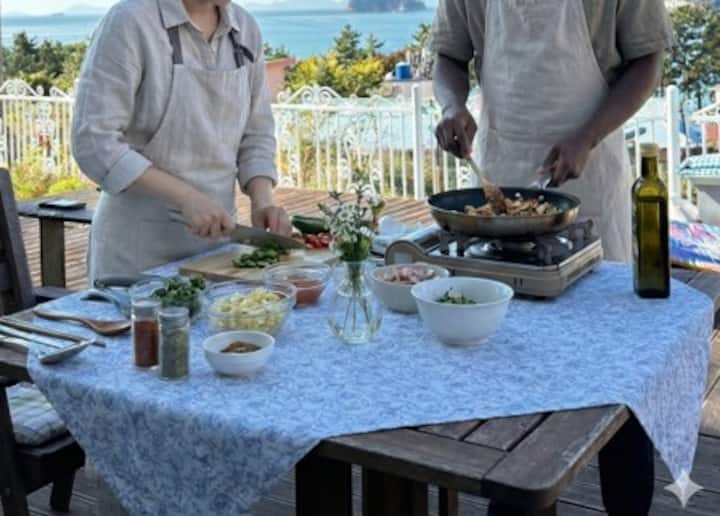 Cours de cuisine locale avec des ingrédients de la mer de Namhae dans une cuisine avec vue sur la mer - En mode anglais