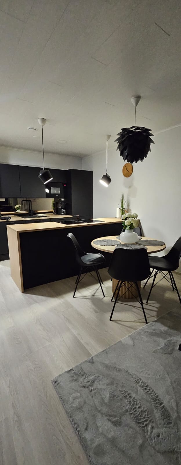 Appartement moderne spacieux au 4e étage donnant sur la station de ski au centre du village. Regardez les aurores boréales depuis votre fenêtre. Deux salles de bain avec 3 douches et un sauna. Cuisine entièrement équipée. Trois chambres avec chacune 2 lits simples et un canapé-lit. Place de parking gratuite avec chauffage. Local à skis et zone de fartage. Nous aimons vous aider pour vos excursions ou vos questions. Arrêt de bus de l'aéroport et de ski devant l'appartement.