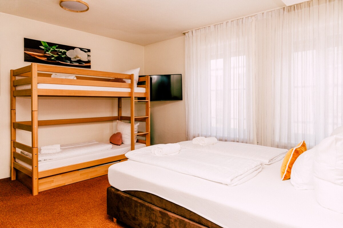 Studio M – Vivre intelligemment. Bien dormir! Le nouveau studio M de 30 m² offre tout ce dont vous avez besoin pour vivre avec style - lit à ressorts 160x200 cm, canapé-lit 120x200 cm, kitchenette avec cuisinière à induction, micro-four combiné, télévision intelligente, climatisation, volets roulants y compris 1x nettoyage hebdomadaire et changement de linge y compris la piscine et le sauna de l'hôtel y compris l'utilisation du FitnessLoft en ville Place de parking à réserver Petit dej compris à réserver Bistro de l'hôtel Distributeur automatique de boissons et de collations 24 h/24 et 7 j/7 dans le hall Réception