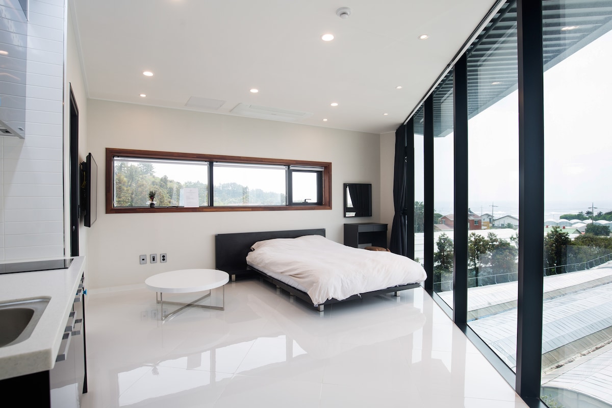 C'est une jolie vue sur l'océan pension steri-nuit sur la rue principale de Handam Cafe, un endroit chaud à Jeju. Vous pouvez voir la mer d'émeraude bleue et le magnifique coucher de soleil d'Aewol, à l'ouest de Jeju, depuis toutes les chambres. Il y a des dépanneurs et des restaurants dans le bâtiment, et divers restaurants et cafés célèbres (Chilsadon, Koijung, Tammy Ramen, Taste Cilantro, Fitzberger' s, Voodoo Restaurant, Landis Donut, Dream Aewol, Spring Day, Sunset Cliffs, High End, Right Now, Pampane, etc.) sont tous accessibles à pied. Vous pouvez marcher le long du sentier Aewol Handam jusqu'à la plage de Gwakji, et vous pouvez profiter du kayak à la plage de Handam. Il y a un grand parking, et il y a 3 arrêts de bus à proximité, c'est donc le meilleur endroit pour les voyageurs avec un seau. Regardez la belle Jeju, nuit étoilée de Sterinite. Classique 1 et 2 sont assignés au hasard au même type de chambre