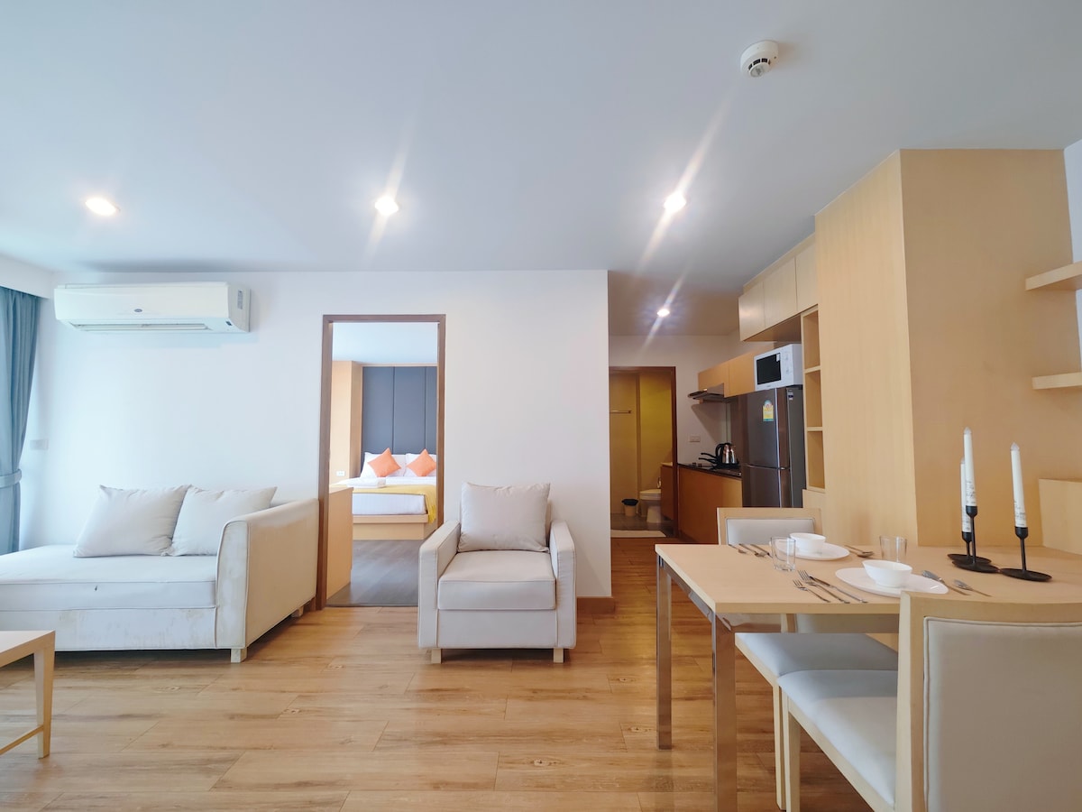 Un appartement entier spacieux avec salle de bain privée, kitchenette, séjour/salle à manger, 1 chambre avec espace de travail désigné et balcon. Profitez des larges fenêtres pour une vue imprenable et beaucoup de lumière du soleil, augmentant l'aération pour un séjour plus relaxant. Profitez de toutes les commodités de la vie urbaine, notamment : - À 5 min de BTS Asok, MRT Sukhumvit - à 5 min de Terminal 21, Emporium/Emquartier et du parc Benjasiri - À 1 min du magasin 7-11 - Beaucoup de cuisine de rue, café et taxis/vélos