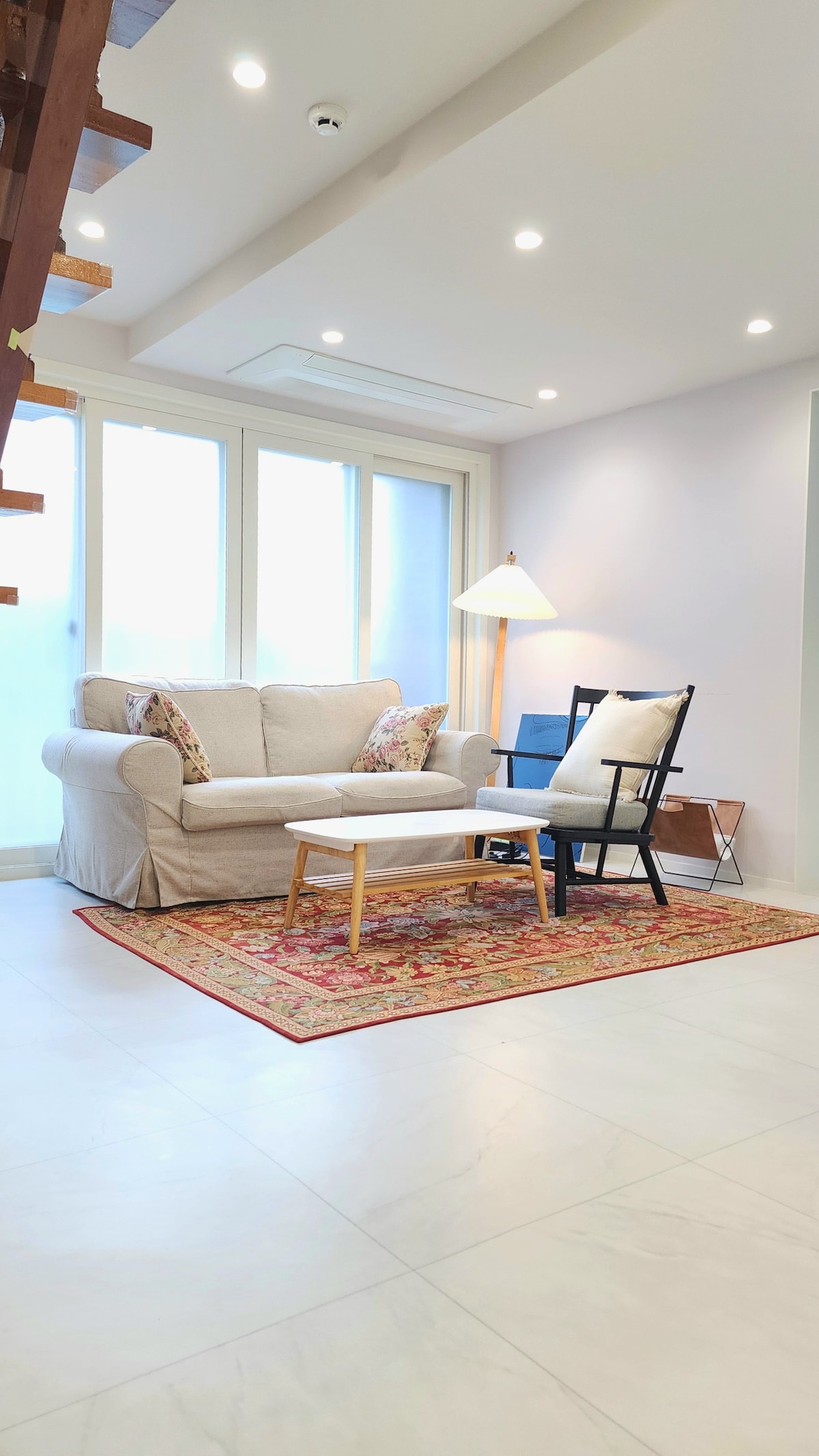 Maison de Dadaepo Stay, a red brick house nestled in a quiet alley of Busan's Dadaepo. The space features a cafe on the first floor and accommodations on the second. Ascending the wooden staircase reveals a cozy space bathed in sunlight, featuring natural wood interior design. Room 2: 2 double beds, 1 loft sofa bed Accommodates up to 6 guests. Open the door beside the loft to access the artificial grass rooftop, where you can enjoy movies under the hammock and lights.