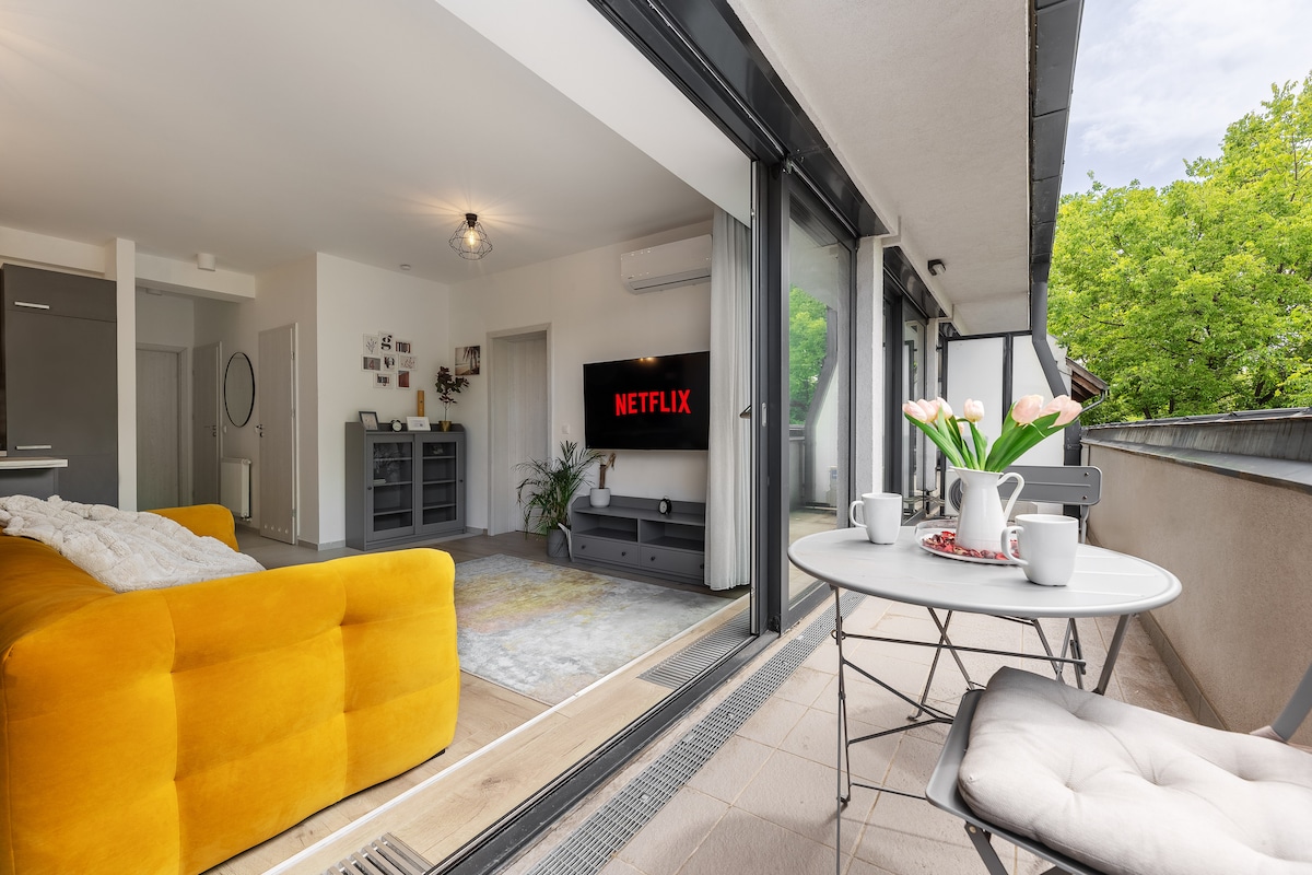 Beautiful, modern, bright and newly furnished apartment with balcony in the 13rd district close to the Danube! FREE PARKING in the garage. Lovely and peaceful location, however it has quick access to the city center (Deák square 12 min by metro/no transfer). The metro station is 150 m from the apartment! Free gifts for our guests! It can accommodate 4 people. The air-conditioned apartment has a bedroom for two (king bed - 180x200), a spacious living room with a sofa-bed for two (150x200).