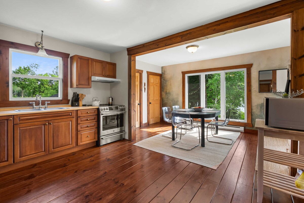 Magnifique chalet dans un secteur paisible sur le bord de l'eau. Rue privé loin des chemins principaux. SPA, Foyer elect, grande aire ouverte avec tous les services sur place et air climatisé. Foyer extérieur. Cuisines, salle de bain et salle de lavage complète. Comptoir lunch et ambiance d'époque avec toit cathédrale dans le salon. Cuisine complète avec tout les petits électroménagers. Ustensiles et vaisselle complète pour 8 personnes. Accès WIFI gratuit.Numéro d'établissement : 299848