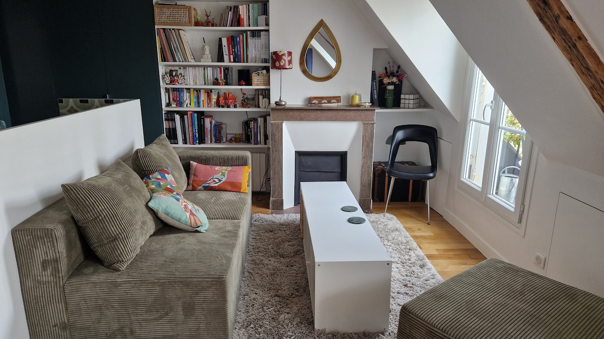 6 e étage avec ascenseur, 2 chambres avec lit double et un canapé dans le salon (5 places), une cheminée et une salle de bain. Lumineux et proche du Sacré-Cœur et du Moulin Rouge, mon appartement est calme, doux et original, au coeur d'un quartier plein de bars et de restaurants.