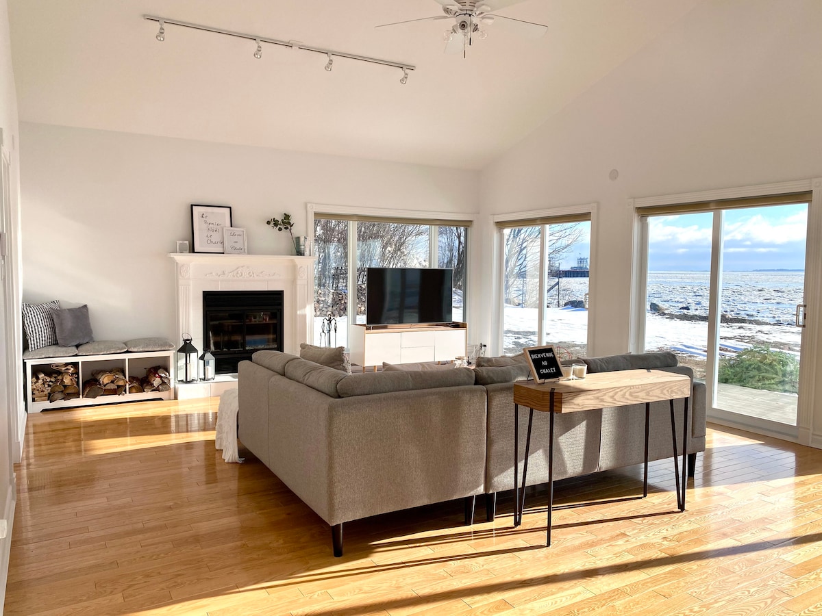 Situé sur un chemin privé, magnifique maison de campagne avec vue spectaculaire sur le fleuve St-Laurent. Toit cathédrale avec foyer double face. La grande verrière de 28 pieds ainsi que les 2 chambres à coucher font face au coucher de soleil. Electroménagers haut-de-gamme. Terrain boisé et intime de 140 000pi carré avec accès à un petit lac. Patinoire naturelle en hiver. Terrasse extérieure avec BBQ. Foyer extérieur. Une propriété au cachet unique. Non-fumeurs, pas d'animaux Verrière 3 saisons