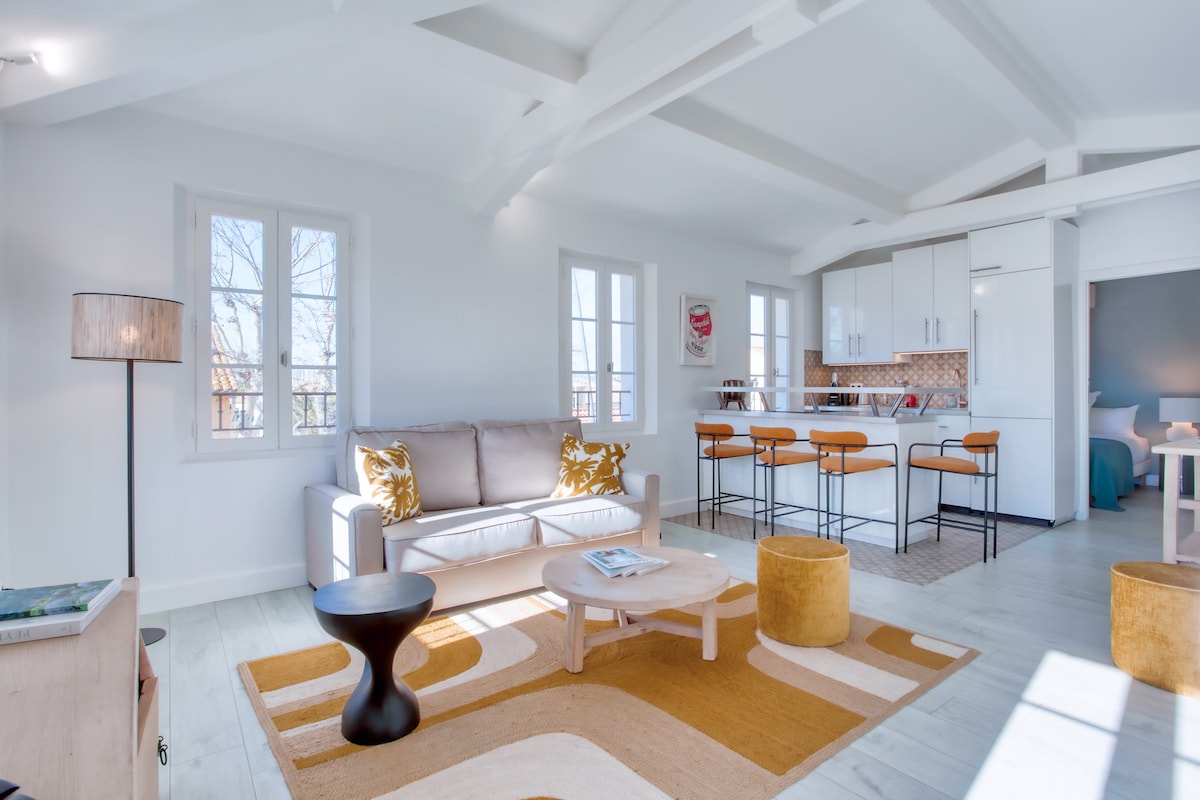 Fans absolus du village de St Tropez, c’est avec toute notre fougue et notre jeunesse que nous avons rénové cet appartement par nos soins. Appartement à 2 pas du Sénéquier, du marché aux poissons, à 2 minutes à pieds de la Ponche et 4 minutes de la place des Lices. Situé au-dessus de la boulangerie la plus célèbre du vieux village, viennoiseries et Tropeziennes ne sont, qu’à quelques marches. Nous serons ravis de vous accueillir pour vous faire découvrir le charme de notre village.